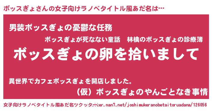 | 男性向けラノベタイトル風あだ名 | 『ダンジョンにボッスぎょを求めるのは間違っているだろうか』 |