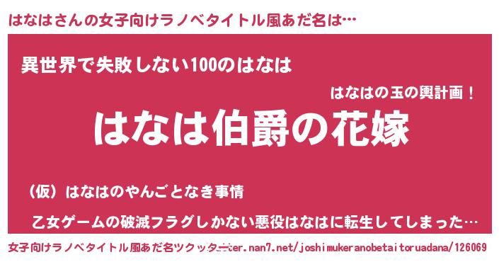 | 男性向けラノベタイトル風あだ名 | 『うちの娘の為ならば、俺はもしかしたらはなはも倒せるかもしれない。』 |