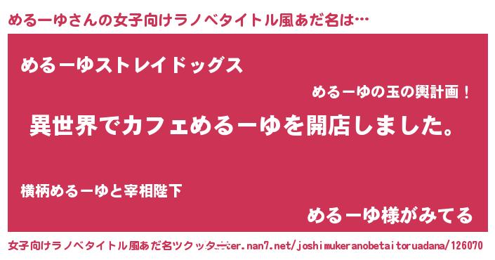 | 男性向けラノベタイトル風あだ名 | 『誰もが恐れるあのめるーゆが、ぼくの専属メイドになるようです。』 |