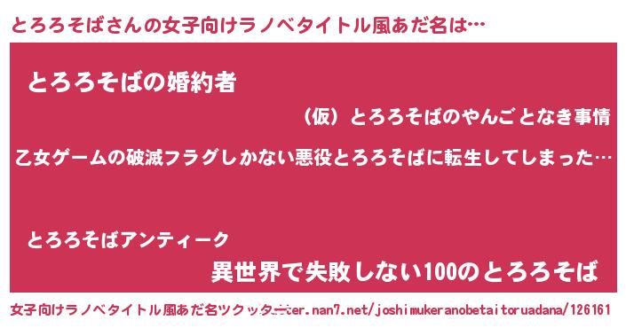 | 男性向けラノベタイトル風あだ名 | 『この素晴らしい世界にとろろそばを!』 |