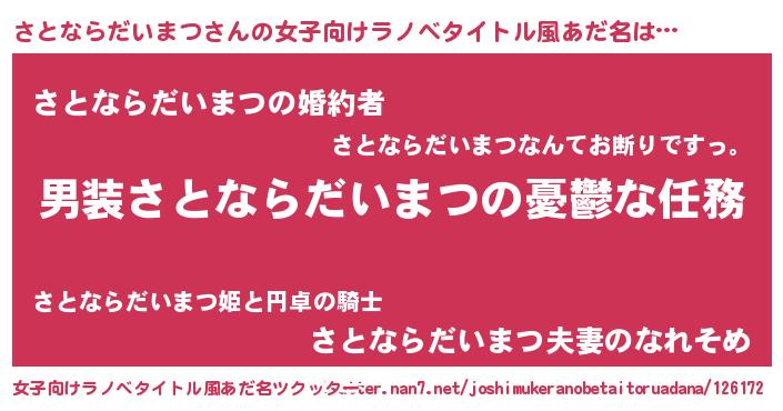 | 男性向けラノベタイトル風あだ名 | 『うちのさとならだいまつが世界を掌握している!』 |