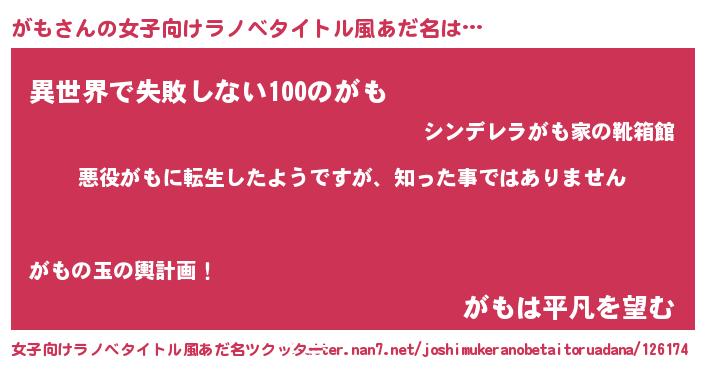 | 男性向けラノベタイトル風あだ名 | 『この素晴らしい世界にがもを!』 |