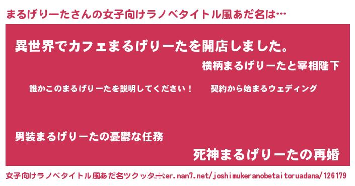 まるげりーたさんの女子向けラノベタイトル風あだ名は… 『誰かこのまるげりーたを説明してください! ~契約から始まるウェディング~』『異世界でカフェまるげりーたを開店しました。』『死神まるげりーたの再婚』 ツクッター #女子向けラノベタイトル風あだ名ツクッター http://tkutter.nan7.net/joshimukeranobetaitoruadana/126179/