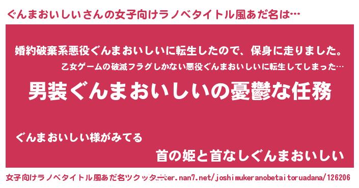 | 男性向けラノベタイトル風あだ名 | 『冴えないぐんまおいしいの育てかた』 |