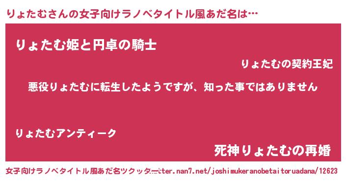 | 男性向けラノベタイトル風あだ名 | 『この素晴らしい世界にりょたむを!』 |
