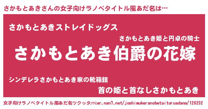 | 男性向けラノベタイトル風あだ名 | 『やはりさかもとあきの青春ラブコメはまちがっている 』 |