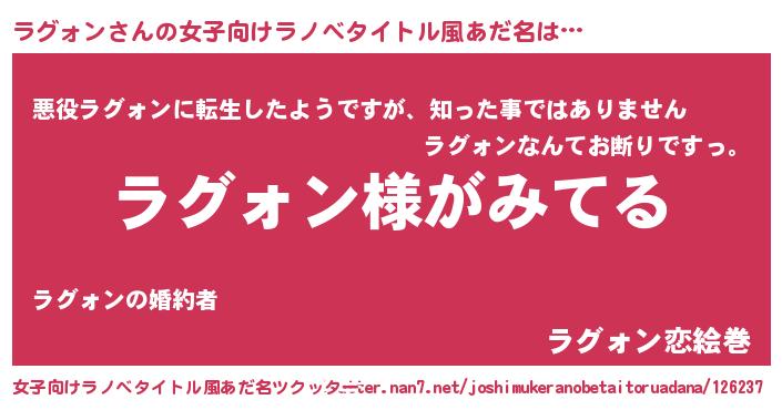 | 男性向けラノベタイトル風あだ名 | 『ラグォンの嫁は女の子じゃないと思った?』 |