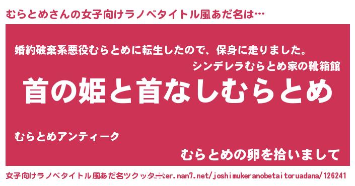 むらとめさんの女子向けラノベタイトル風あだ名は… 『首の姫と首なしむらとめ』『婚約破棄系悪役むらとめに転生したので、保身に走りました。』『むらとめの卵を拾いまして』 ツクッター #女子向けラノベタイトル風あだ名ツクッター http://tkutter.nan7.net/joshimukeranobetaitoruadana/126241/