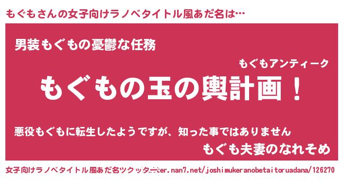 | 男性向けラノベタイトル風あだ名 | 『転生したらもぐもだった件』 |