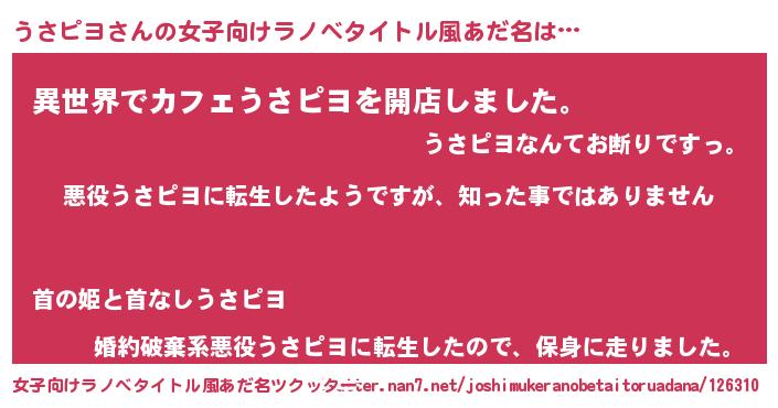 | 男性向けラノベタイトル風あだ名 | 『この素晴らしい世界にうさピヨを!』 |