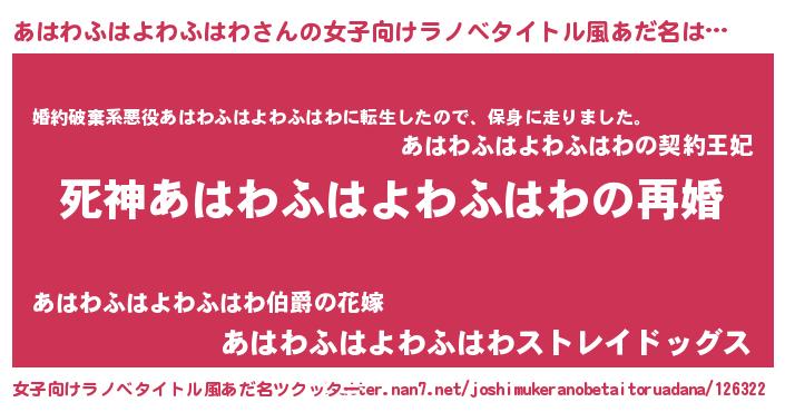| 男性向けラノベタイトル風あだ名 | 『ノーゲーム・ノーアハワフハヨワフハワ』 |