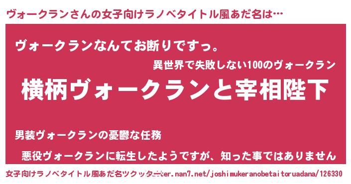 | 男性向けラノベタイトル風あだ名 | 『ヴォークランに滅ぼされるだけの簡単なお仕事です』 |