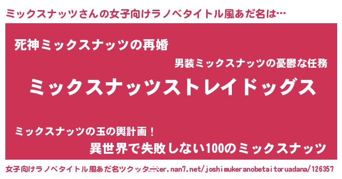 | 男性向けラノベタイトル風あだ名 | 『Re:ミックスナッツから始める異世界生活』 |
