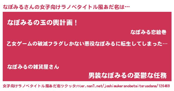 | 男性向けラノベタイトル風あだ名 | 『魔弾の王となぽみる』 |