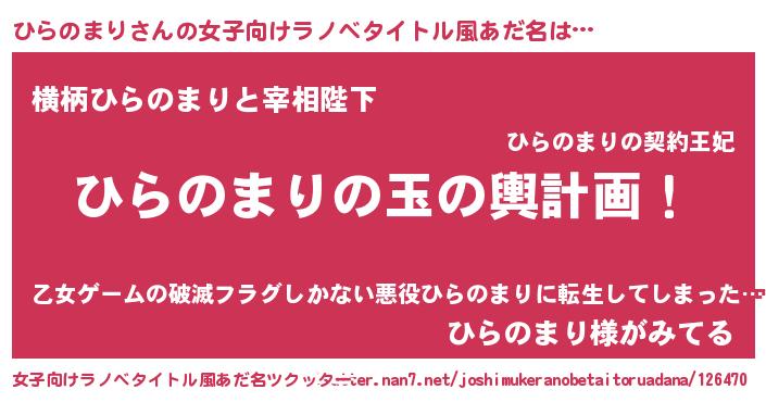 | 男性向けラノベタイトル風あだ名 | 『ひらのまり~年齢イコール彼女いない歴の魔法使い~』 |