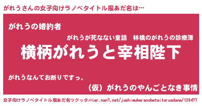 | 男性向けラノベタイトル風あだ名 | 『がれうに滅ぼされるだけの簡単なお仕事です』 |