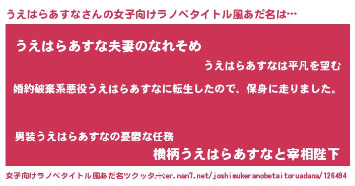 | 男性向けラノベタイトル風あだ名 | 『転生したらうえはらあすなだった件』 |