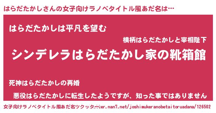 | 男性向けラノベタイトル風あだ名 | 『緋弾のハラダタカシ』 |