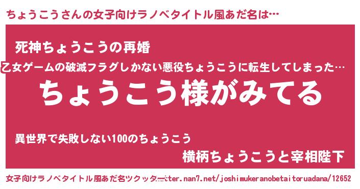 | 男性向けラノベタイトル風あだ名 | 『ちょうこうの嫁は女の子じゃないと思った?』 |