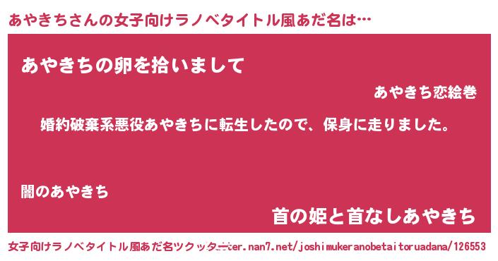 | 男性向けラノベタイトル風あだ名 | 『アヤキチスレイヤー』 |