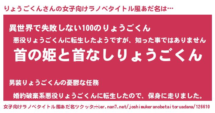 | 男性向けラノベタイトル風あだ名 | 『はたらくりょうごくんさま!』 |