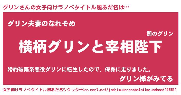 | 男性向けラノベタイトル風あだ名 | 『グリンに滅ぼされるだけの簡単なお仕事です』 |