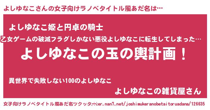 | 男性向けラノベタイトル風あだ名 | 『よしゆなこ~年齢イコール彼女いない歴の魔法使い~』 |