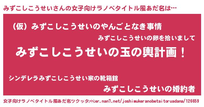| 男性向けラノベタイトル風あだ名 | 『みずこしこうせい~年齢イコール彼女いない歴の魔法使い~』 |