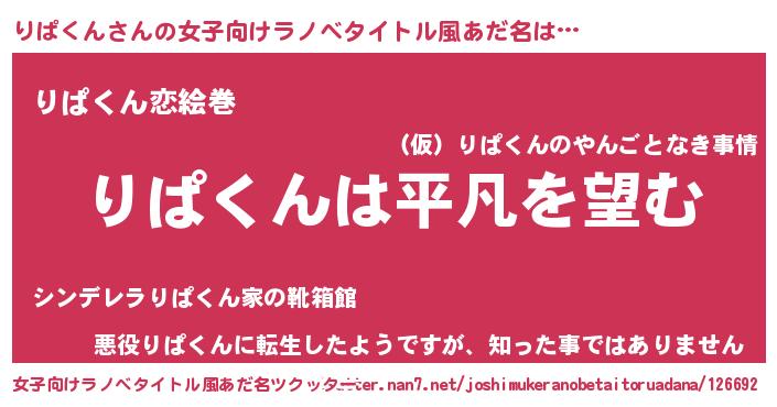 | 男性向けラノベタイトル風あだ名 | 『ダンジョンにりぱくんを求めるのは間違っているだろうか』 |