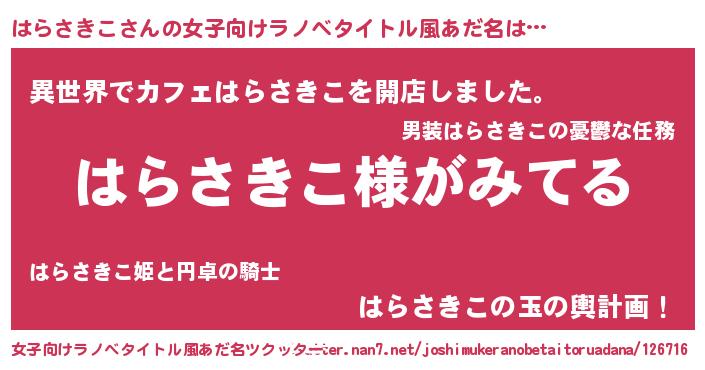| 男性向けラノベタイトル風あだ名 | 『はらさきこの嫁は女の子じゃないと思った?』 |