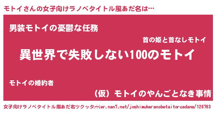 | 男性向けラノベタイトル風あだ名 | 『モトイという概念が存在しない退屈な世界 』 |