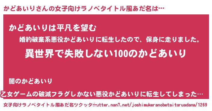 | 男性向けラノベタイトル風あだ名 | 『かどあいりという概念が存在しない退屈な世界 』 |