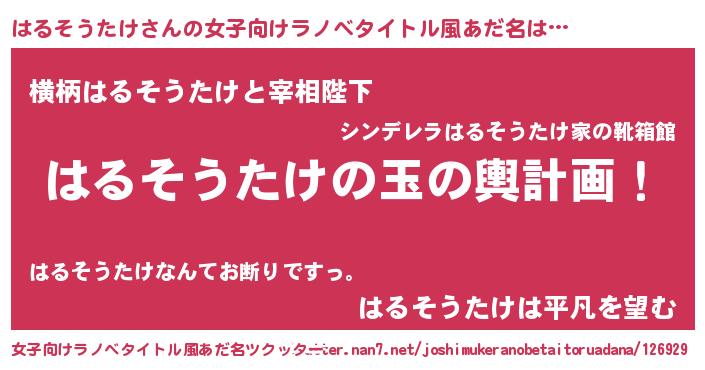 | 男性向けラノベタイトル風あだ名 | 『はるそうたけ~年齢イコール彼女いない歴の魔法使い~』 |