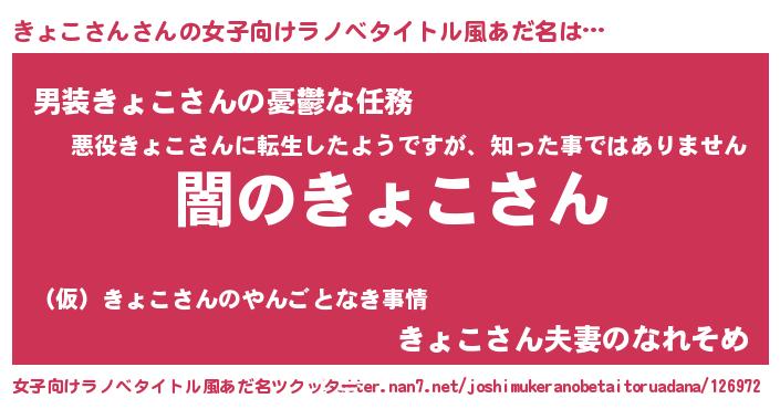 | 男性向けラノベタイトル風あだ名 | 『Re:きょこさんから始める異世界生活』 |