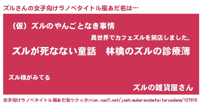 | 男性向けラノベタイトル風あだ名 | 『魔弾の王とズル』『ズルの憂鬱』 |