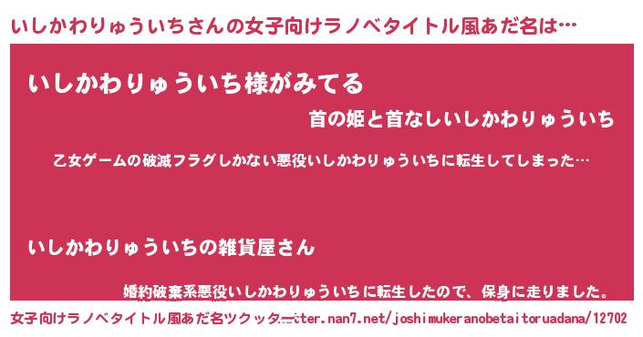 | 男性向けラノベタイトル風あだ名 | 『この素晴らしい世界にいしかわりゅういちを!』 |