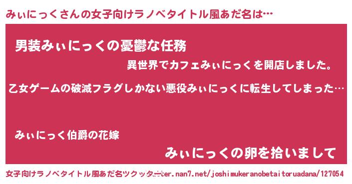 | 男性向けラノベタイトル風あだ名 | 『この素晴らしい世界にみぃにっくを!』 |