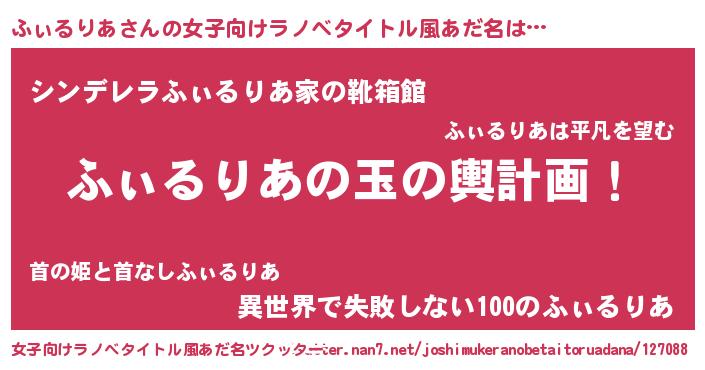 | ヘコむあだ名 | 『ふぃるりあ(笑)』『ふぃっ子』 |