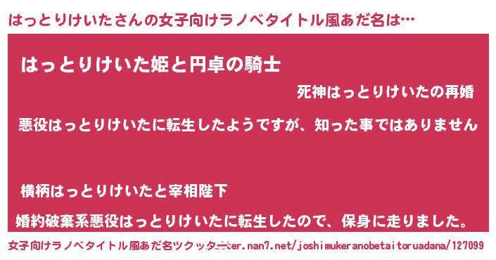 | 男性向けラノベタイトル風あだ名 | 『この素晴らしい世界にはっとりけいたを!』 |