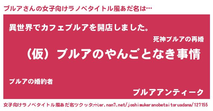 | 男性向けラノベタイトル風あだ名 | 『ブルアの憂鬱』『魔法科高校のブルア』 |