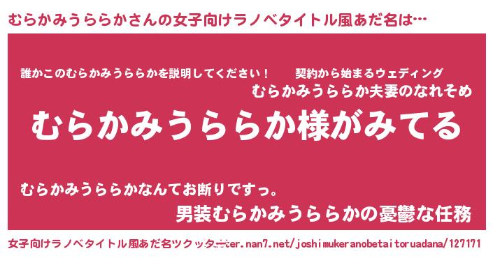 | 男性向けラノベタイトル風あだ名 | 『むらかみうららかの嫁は女の子じゃないと思った?』 |