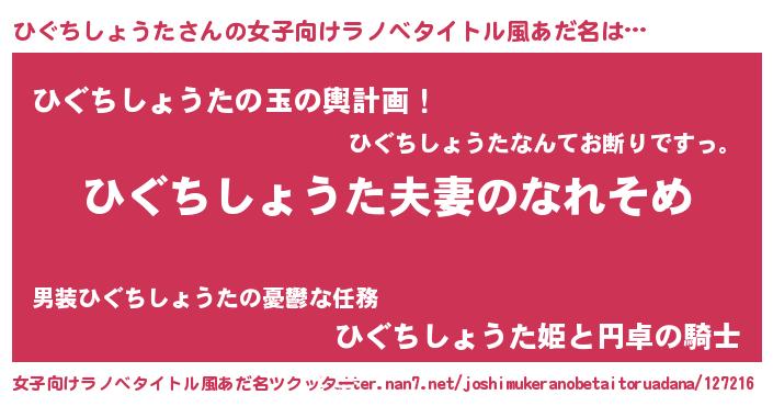 | 男性向けラノベタイトル風あだ名 | 『おまえをオタクにしてやるから、俺をひぐちしょうたにしてくれ! 』 |