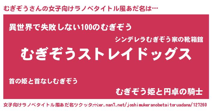 | 男性向けラノベタイトル風あだ名 | 『Re:むぎぞうから始める異世界生活』 |