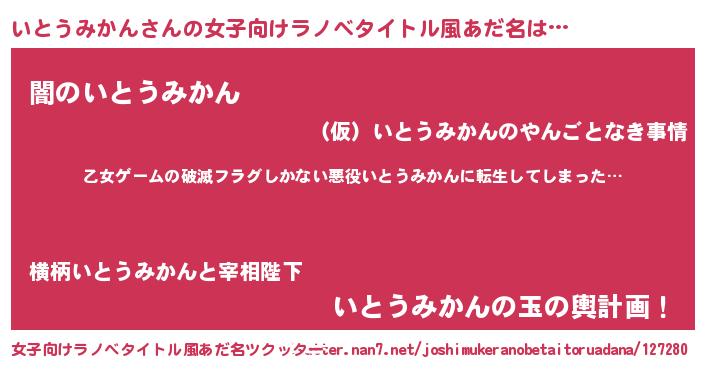 | 男性向けラノベタイトル風あだ名 | 『この素晴らしい世界にいとうみかんを!』 |