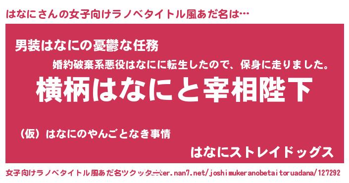 | 男性向けラノベタイトル風あだ名 | 『はなにに滅ぼされるだけの簡単なお仕事です』 |
