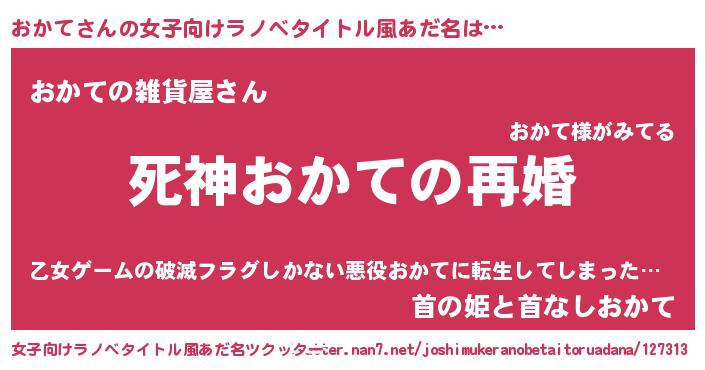 | 男性向けラノベタイトル風あだ名 | 『ノーゲーム・ノーオカテ』 |