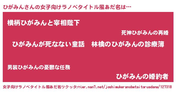 | 男性向けラノベタイトル風あだ名 | 『魔弾の王とひがみん』 |