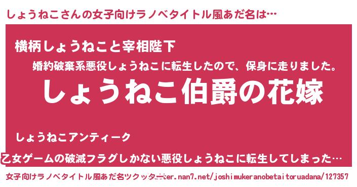 | 男性向けラノベタイトル風あだ名 | 『うちの娘の為ならば、俺はもしかしたらしょうねこも倒せるかもしれない。』 |