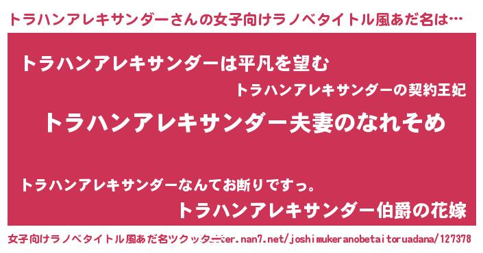 | 男性向けラノベタイトル風あだ名 | 『おまえをオタクにしてやるから、俺をトラハンアレキサンダーにしてくれ! 』 |