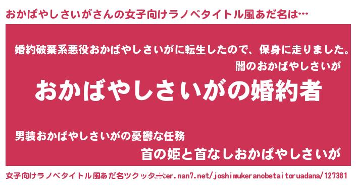 | 男性向けラノベタイトル風あだ名 | 『うちの娘の為ならば、俺はもしかしたらおかばやしさいがも倒せるかもしれない。』 |